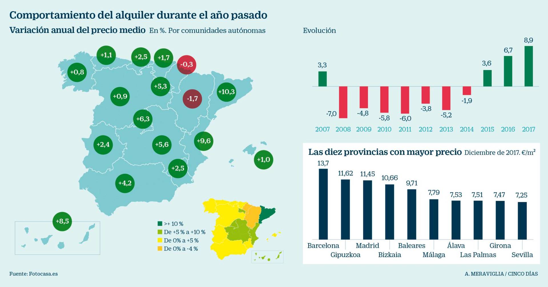 در صورتی که در ۱۰ سال گذشته افزایش ۳ درصدی در اجاره بها عادی به حساب می آمد اما آمار معاملات سالهای اخیر حاکی از افزایش اجاره بها در سراسر اسپانیاست.
